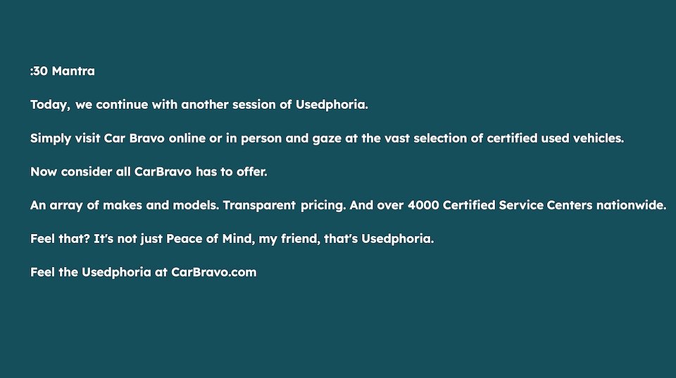 This CarBravo / Audio Streaming Radio campaign features the idea of “usedphoria”— the feeling of getting an amazing used car with amazingly little stress. This might be the first used car campaign that actually relaxes consumers as they listen.